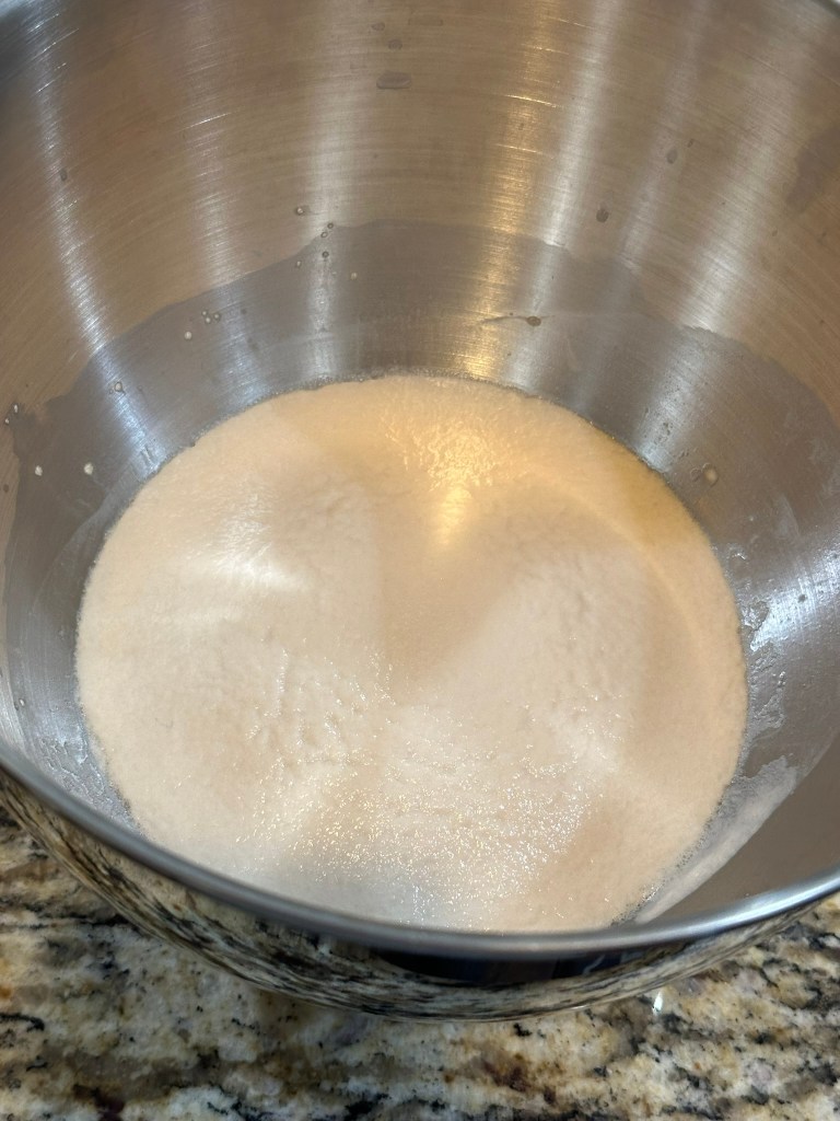 1. Using the mixer, dissolve the yeast and sugar in the warm water and let sit for 5 minutes or until foamy.