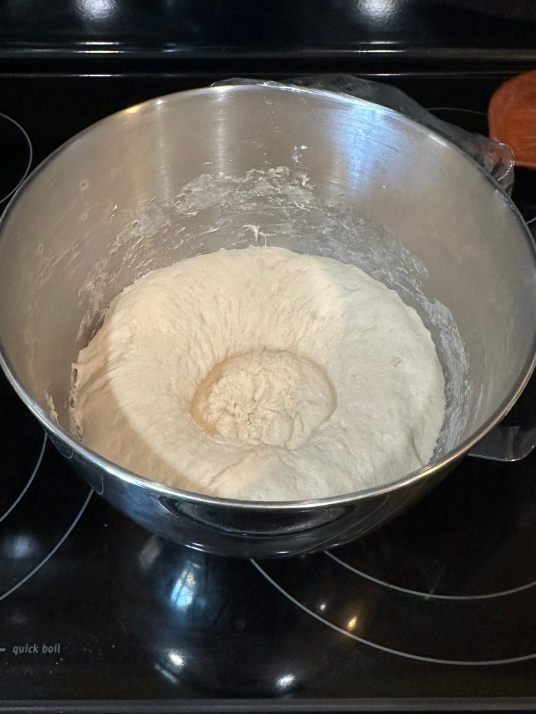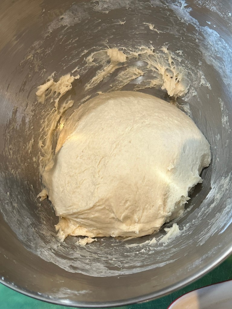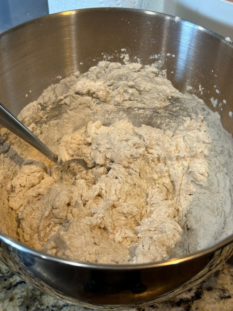 3. Add additional flour, 1/4 cup at a time, until the dough pulls away from the sides of the bowl while mixing and is still slightly sticky to the touch. Careful not to add too much flour.