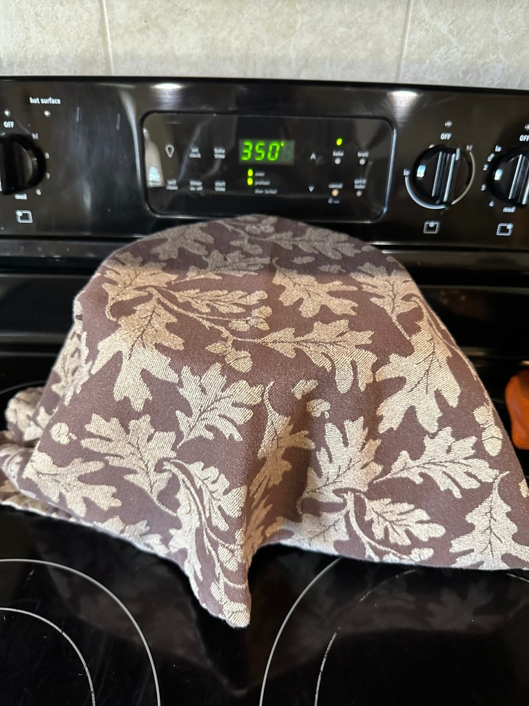 5. Cover with plastic wrap and put in a warm spot to rise for 20-30 minutes. We like to preheat the oven and put the bowl on the stovetop surface. We also covered the plastic wrap with a kitchen towel for this part.