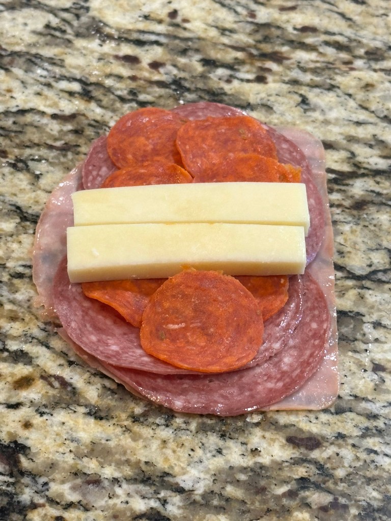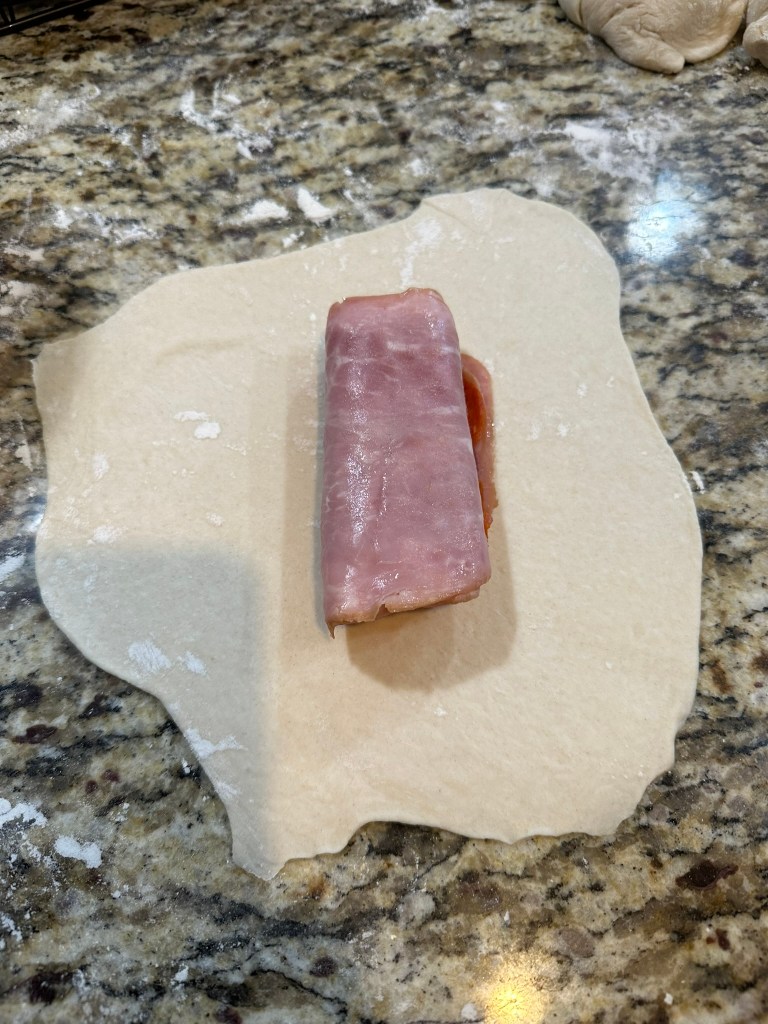 7. For each piece of dough, flatten it out and add to the center: 2 slices of ham, 2 slices of salami, 2 slices of pepperoni wrapped around mozzarella cheese.