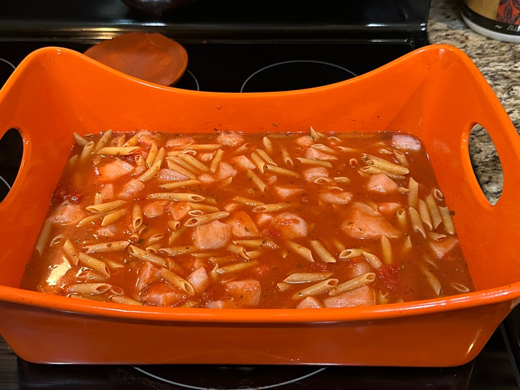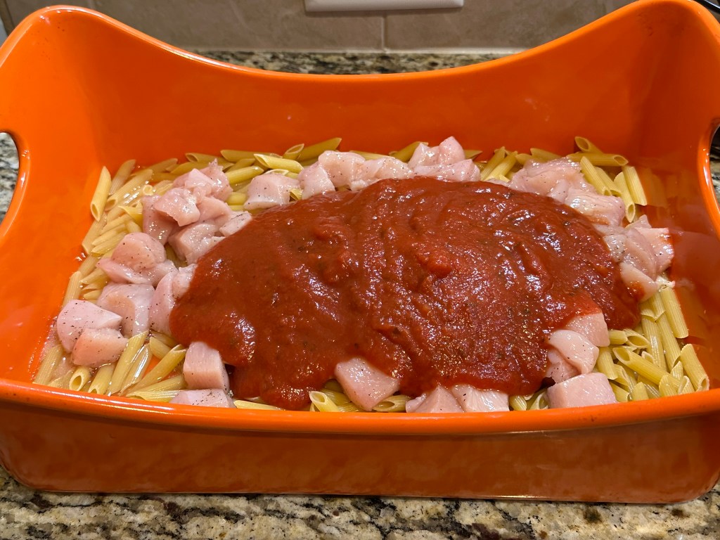 Spread out uncooked penne pasta in the baking dish and add the diced chicken breast with seasonings over the top. Pour the chicken broth and pasta sauce over the top.