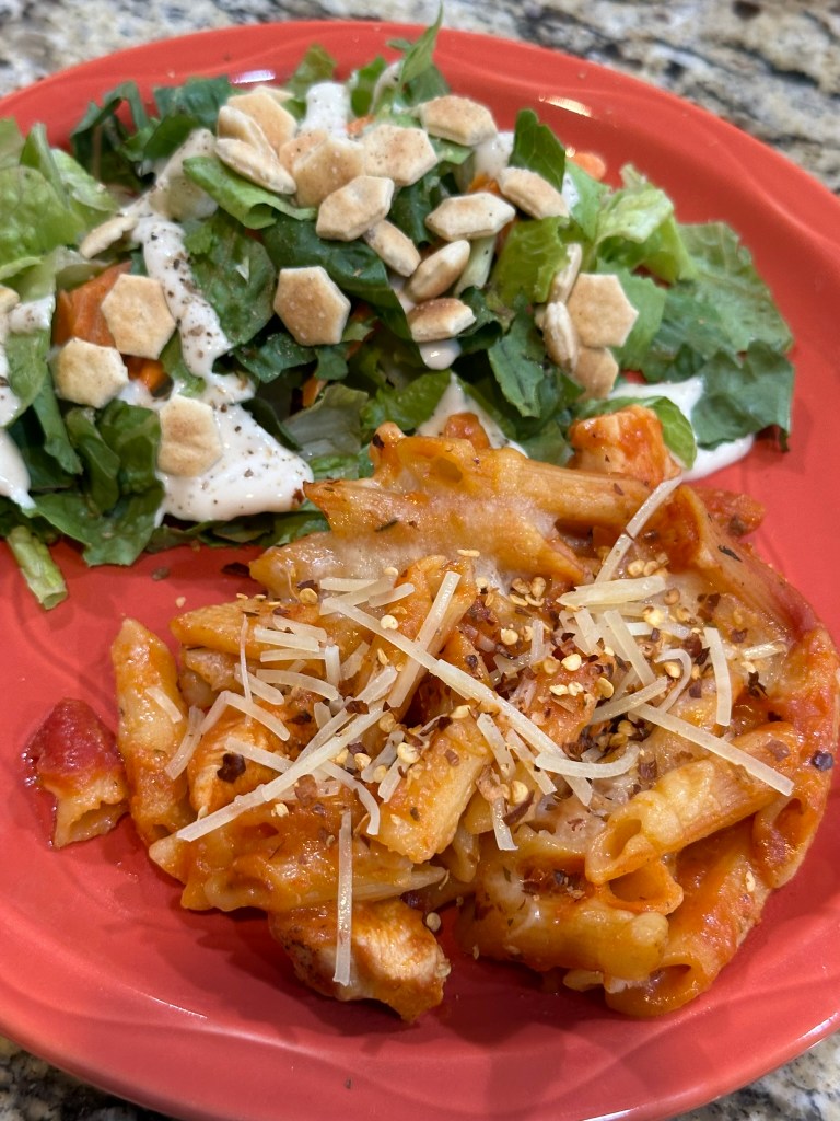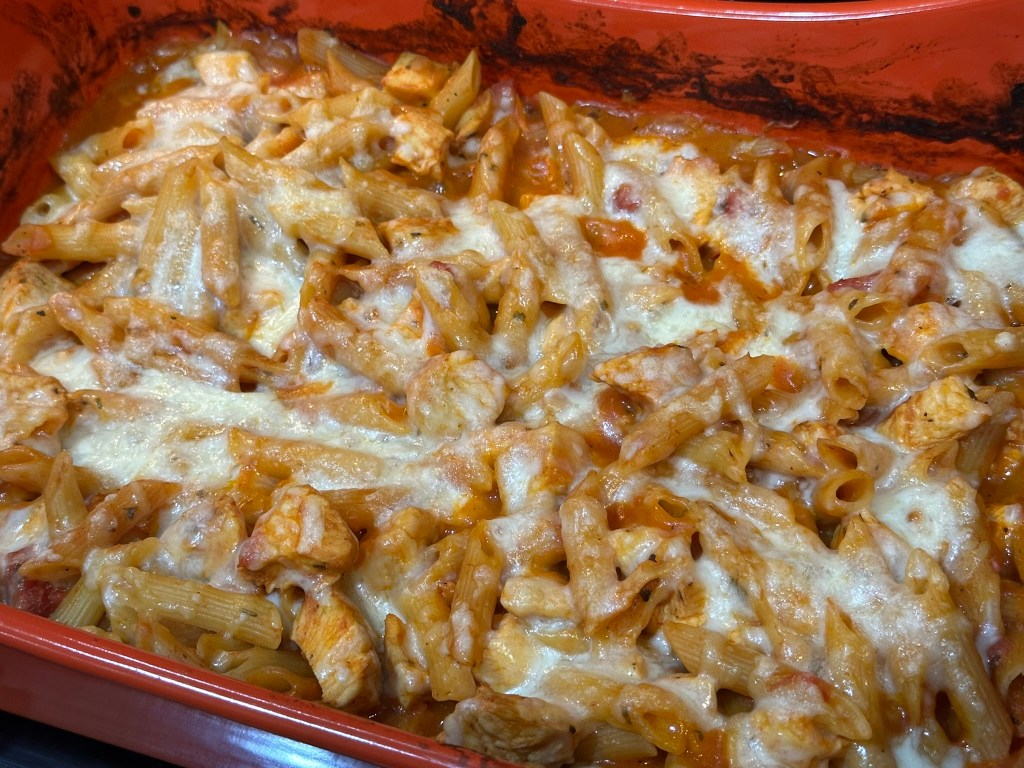 The girls weren’t big fans of the chicken in this but liked the pasta. I want to try it again with precooked sausage and see what they think. It was super easy to throw together and the oven did all the work.