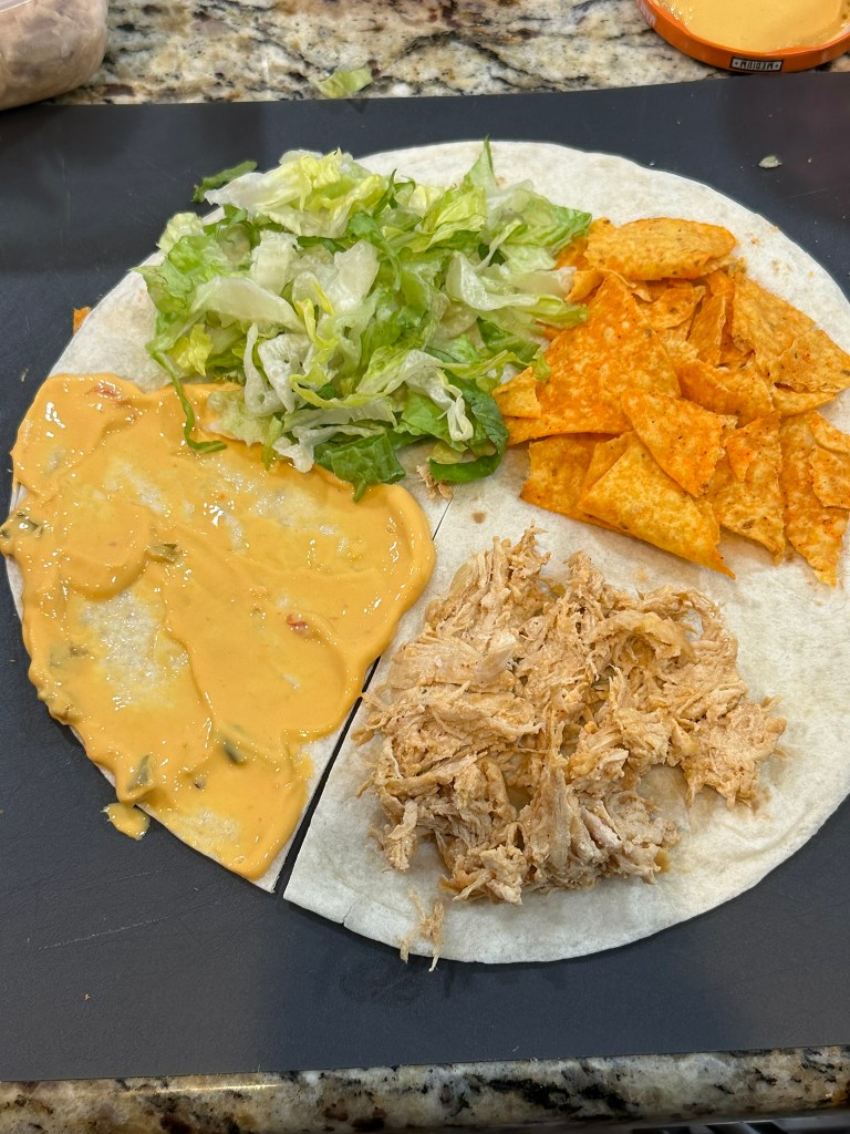 Put your toppings of choice in the 4 quadrants with the queso in the final section like below to help it stick together.