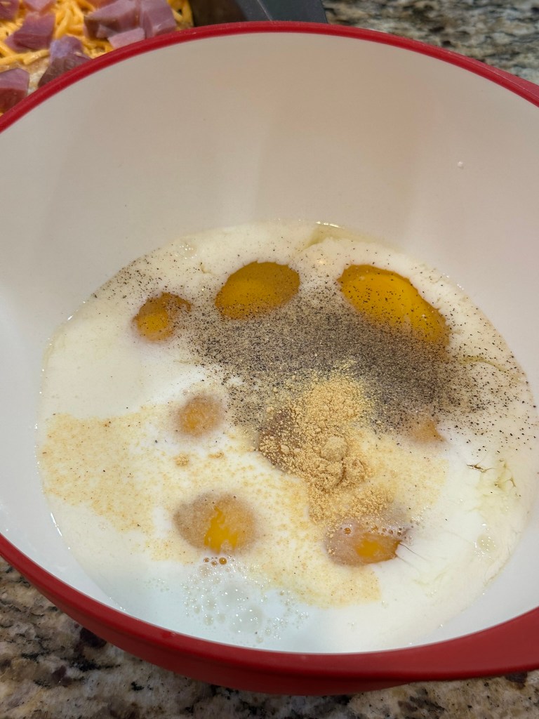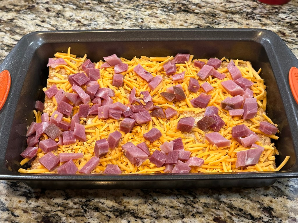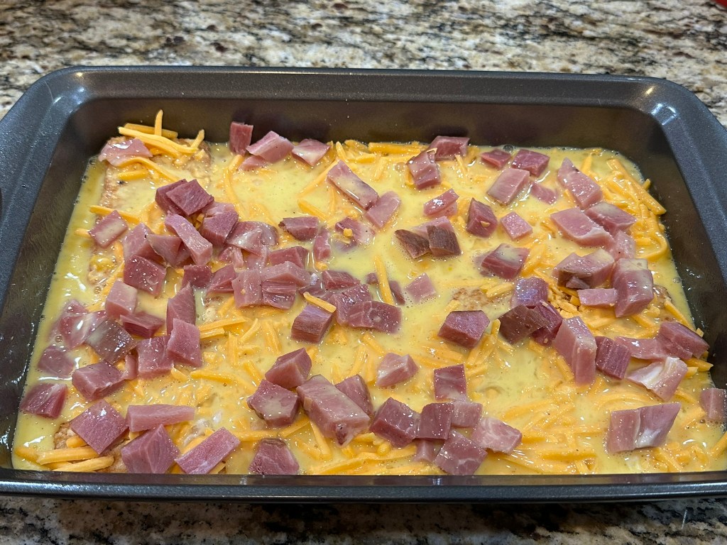 Lay the hash brown patties in a single layer at the bottom of a 9×13 baking dish that has been sprayed with non-stick spray. Add the ham and cheese over the top of them.