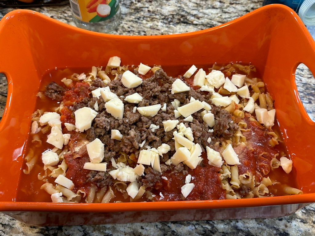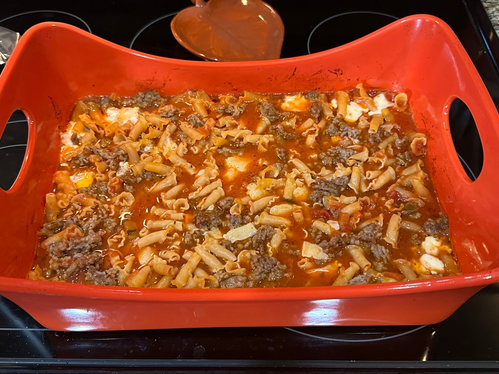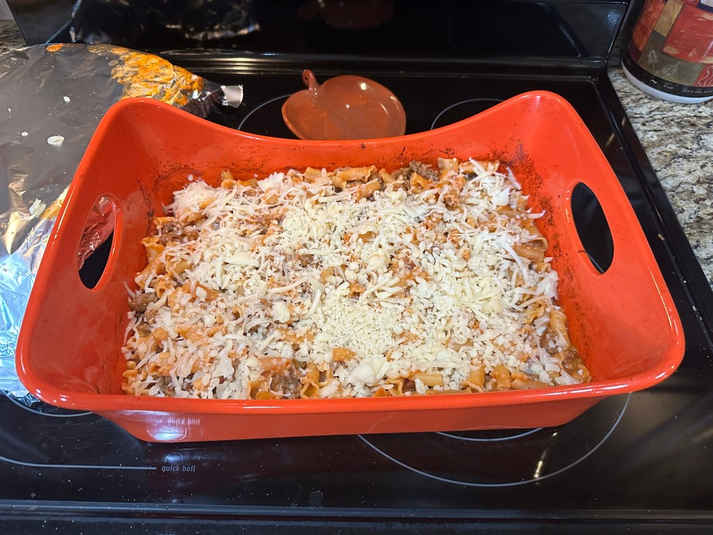 (It would be good to check the pasta at this point and make sure it’s tender. This would be the point where you could add more water if needed and bake longer. The time that I’m including in the recipe worked well for the pasta we chose and the fluid / pasta ratio.)