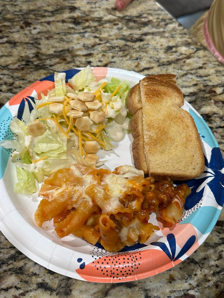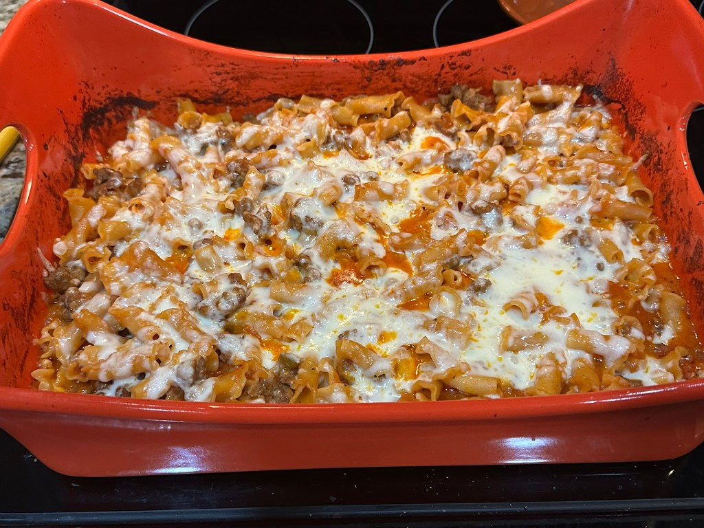 So good! This is a spin off of the Chicken No Boil Pasta Bake that uses Italian sausage instead of chicken. The nice thing with the chicken recipe is that you don’t have to cook the chicken beforehand but you do need to cook the sausage before baking for this recipe, so it did take a little more hands on time.