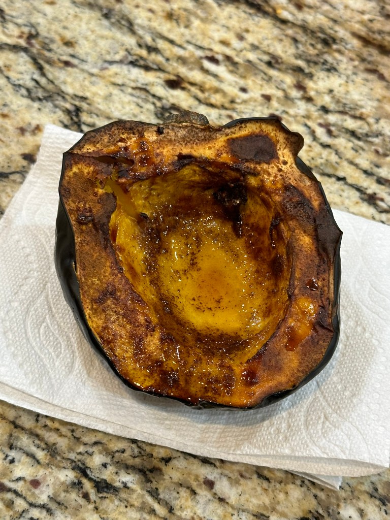 Brush EVOO on the cut sides of the squash and sprinkle with brown sugar and cinnamon.