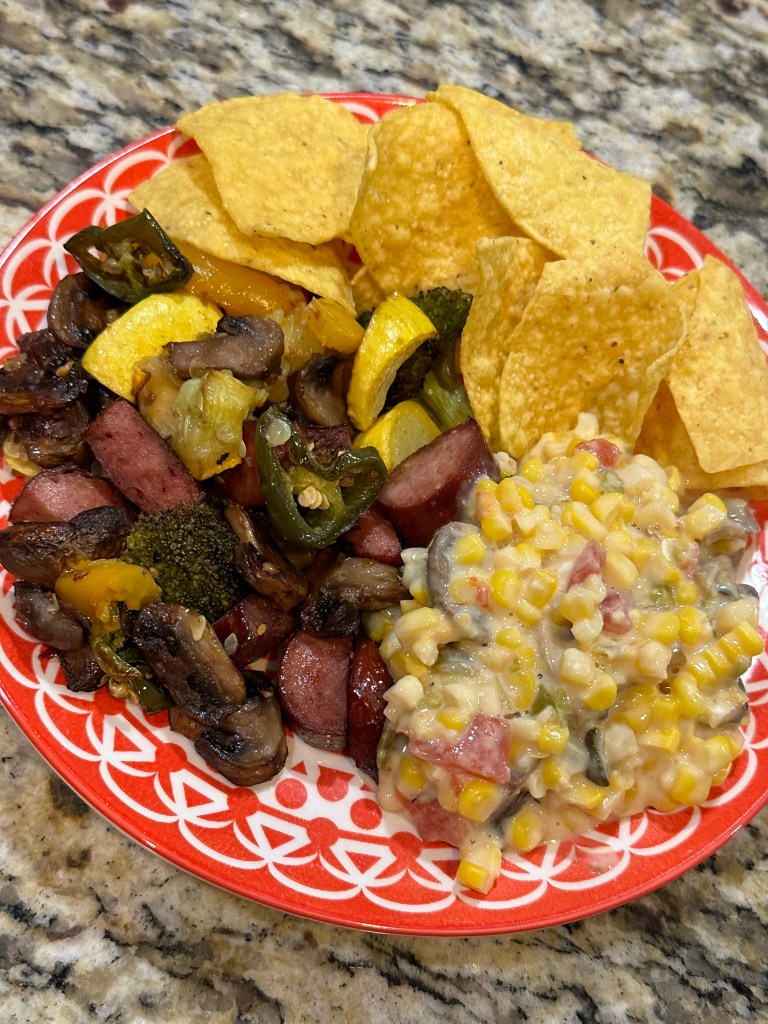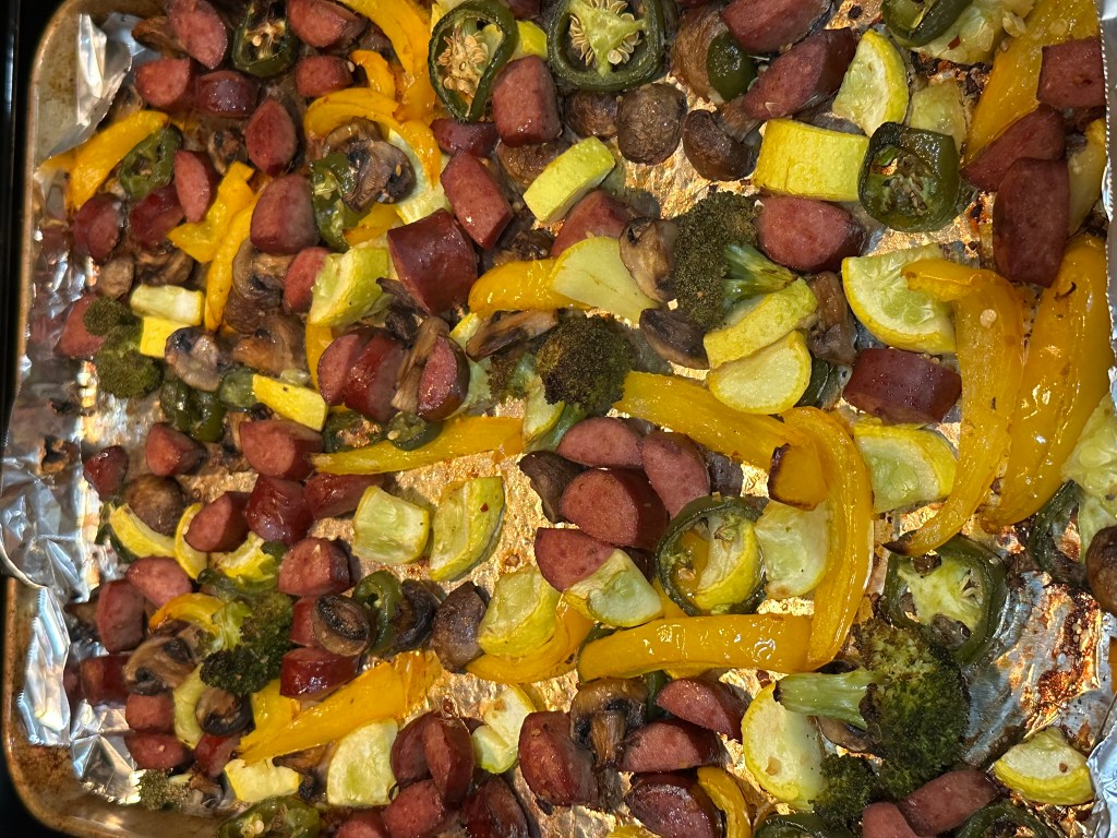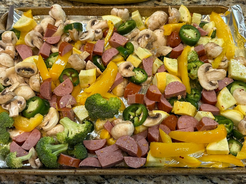 Toss all the ingredients on a sheet pan lined with foil and stir until the EVOO and grill seasoning are distributed throughout.