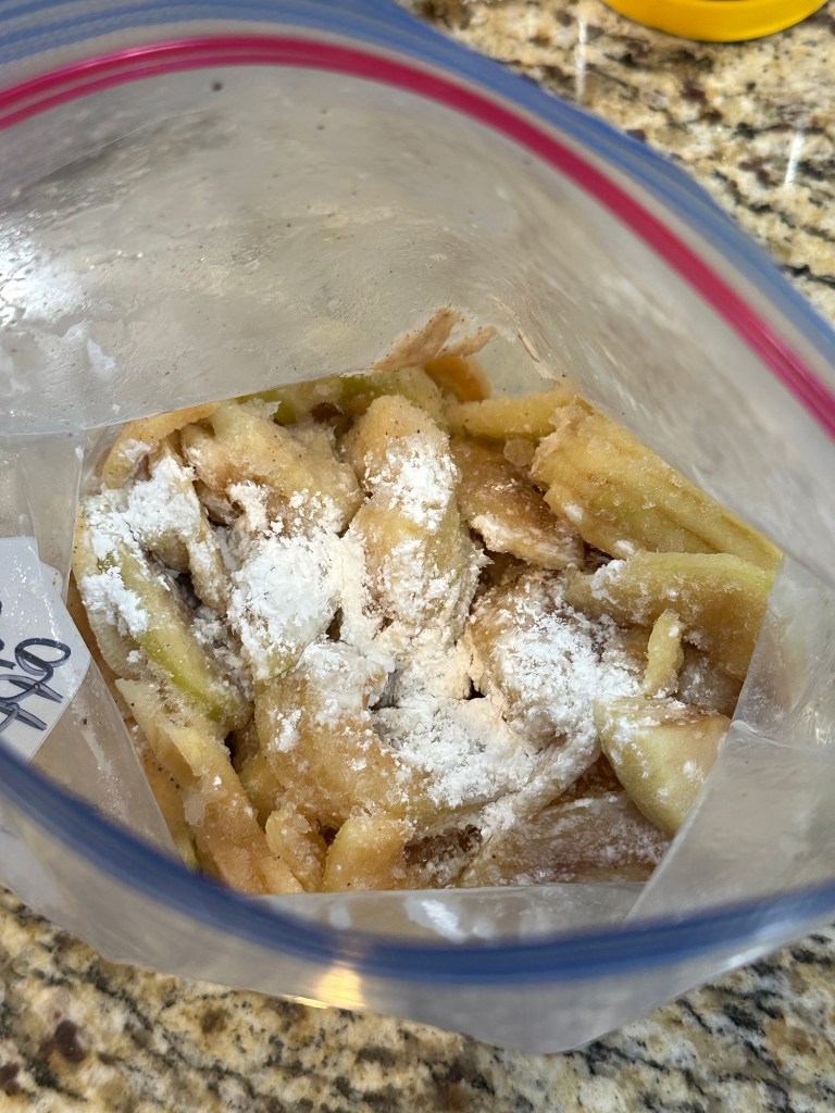 Add 1 tablespoon of cornstarch to the thawed apple mixture and gently stir to combine. I removed a little extra liquid.