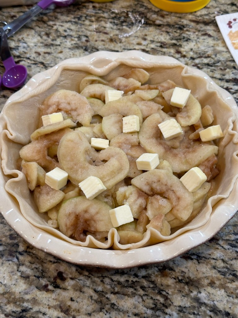 Pour the apples into the bottom pie crust, add a few tablespoons of diced unsalted butter and place the top layer crust over the apples and butter.