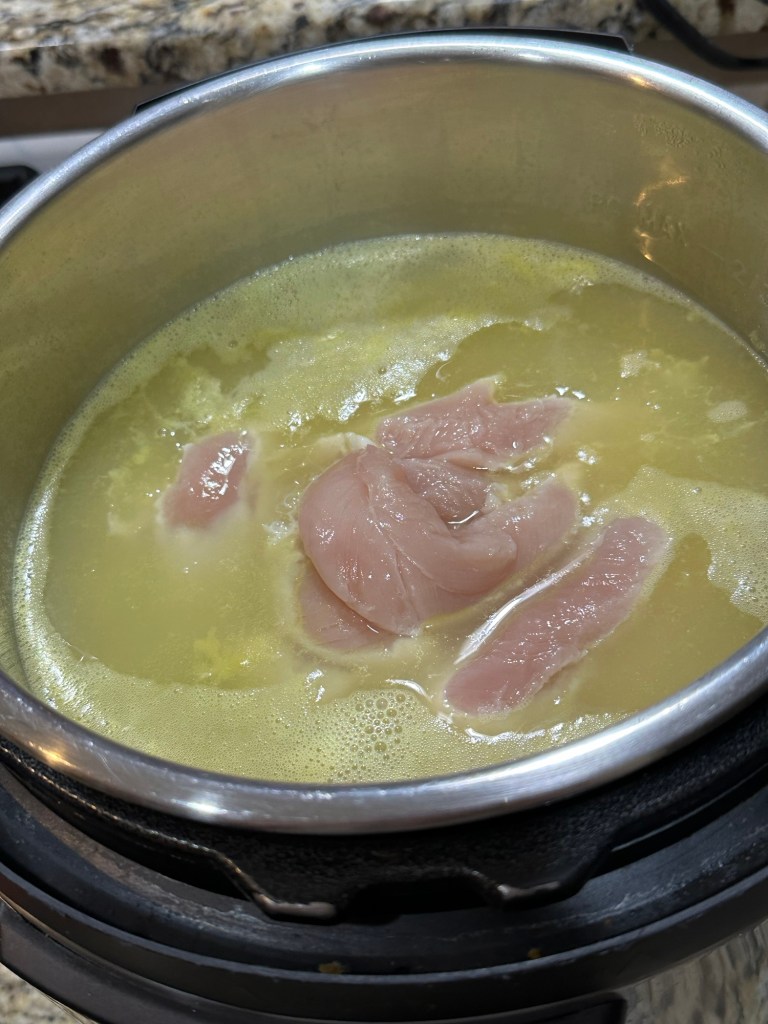 Cook the chicken in the broth using the instant pot on the manual setting for 20 minutes and then shred the chicken. Don’t drain the broth. The shredded chicken goes back into the instant pot with the broth.