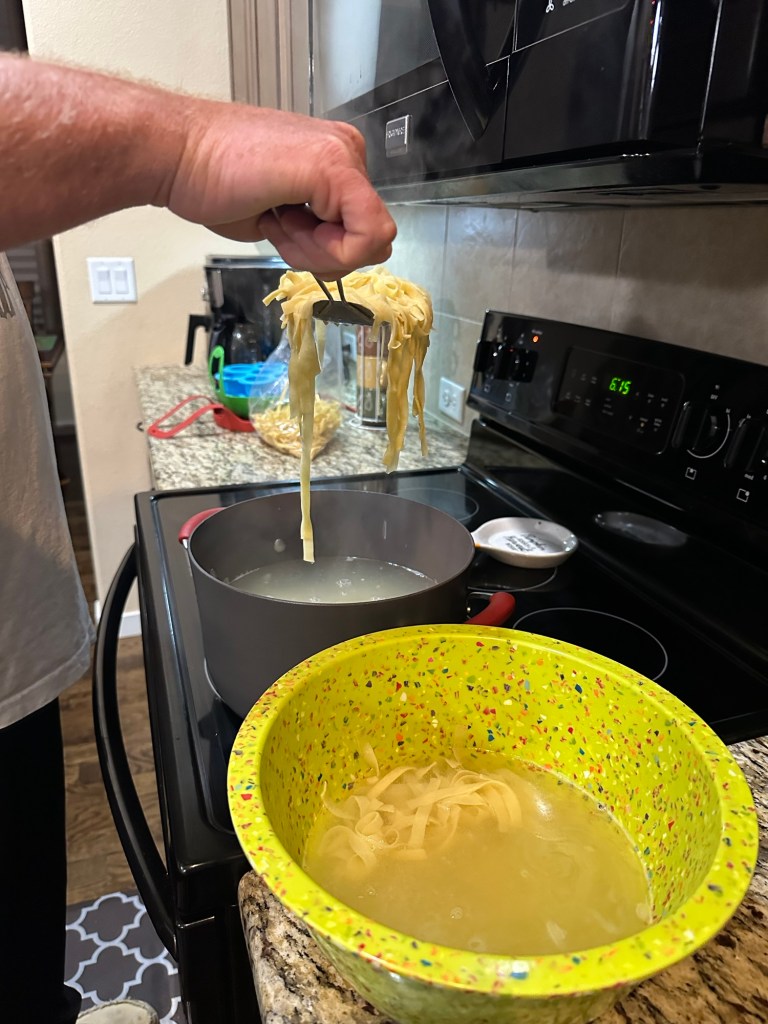 We needed to do a couple batches so the pot wouldn’t be overcrowded with noodles and make them stick together or get mushy.