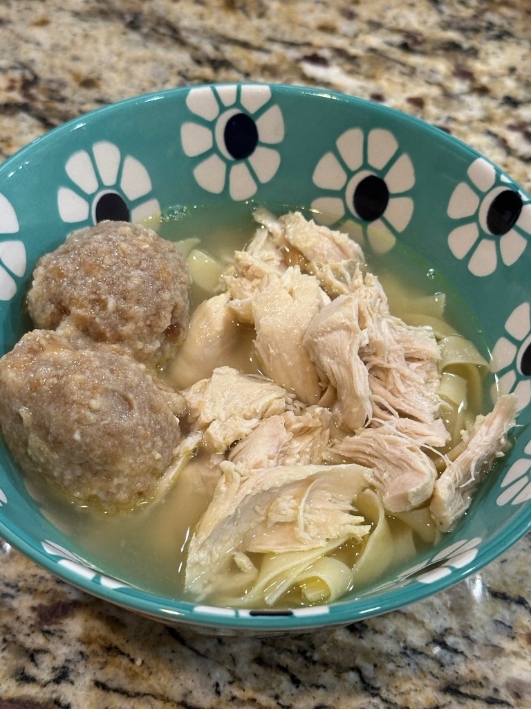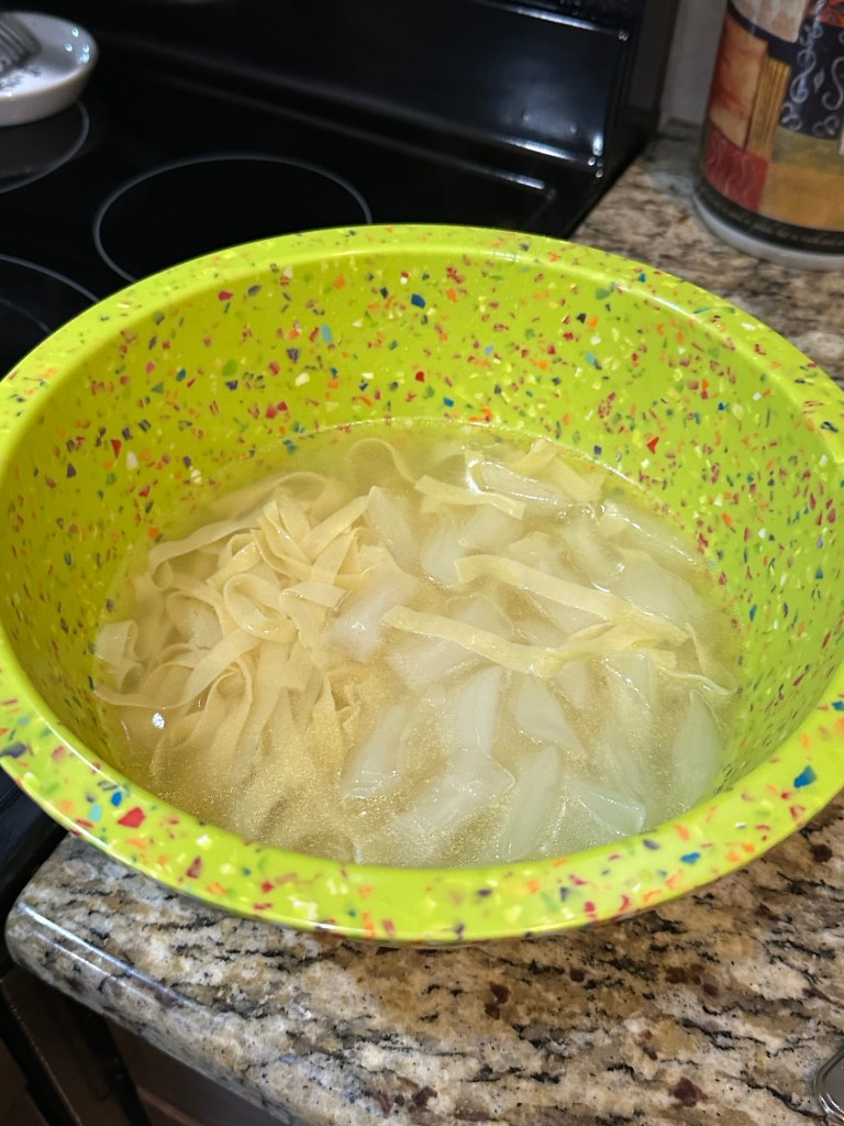 Once the chicken was done, we put a few cups of the cooking broth in a large bowl and added ice to it so the temp would come down and the noodles would stop cooking once they hit the water.