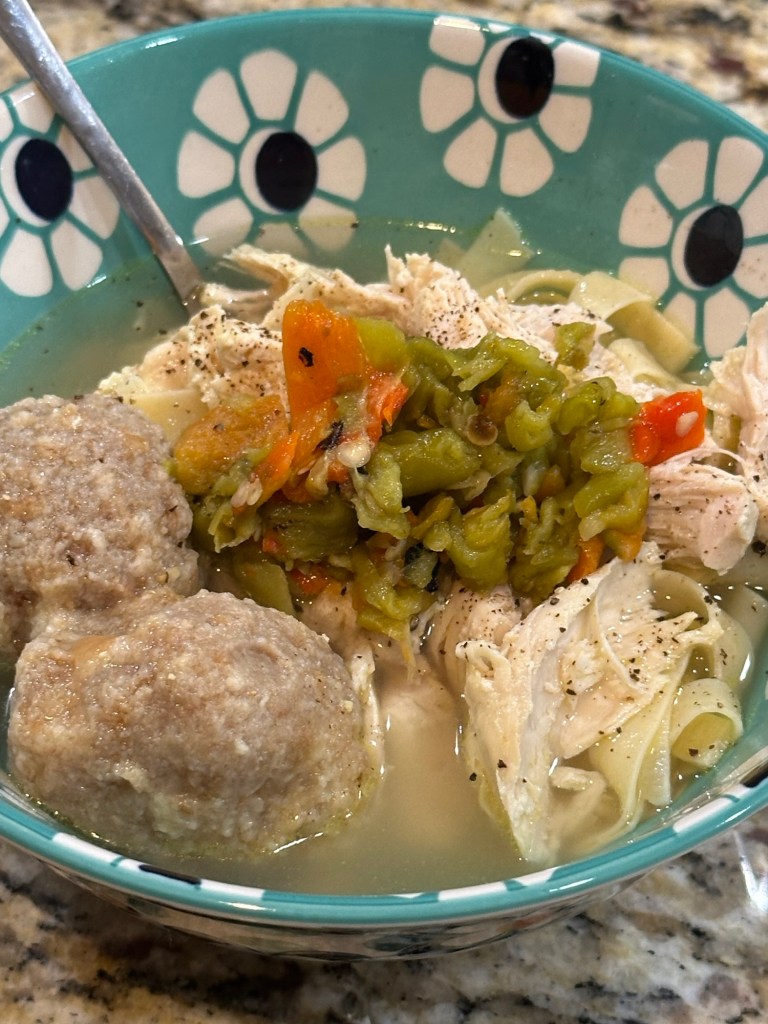 Here’s mine with diced green chiles and a couple of the butterballs. I was the only one that liked them, but I thought they were really good. ❤