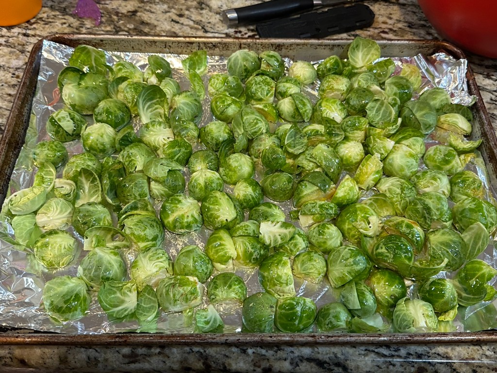 Pour the brussel sprouts onto a large foil-lined baking sheet and arrange the sprouts to be cut side down.