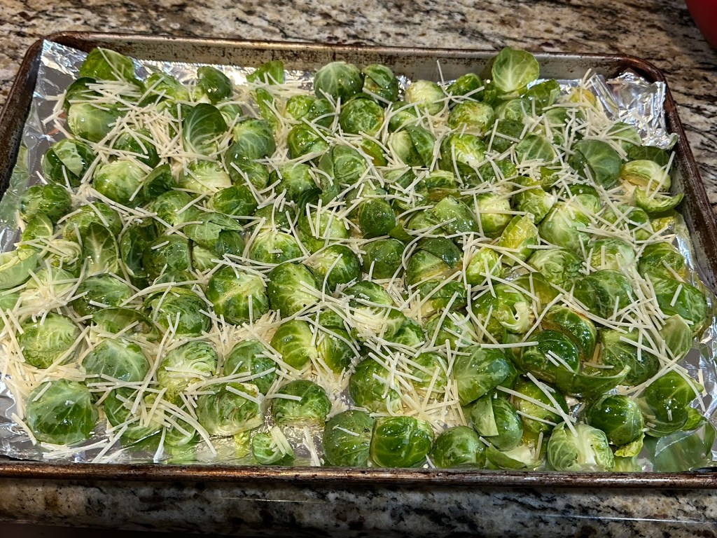 Cut off the stems of the brussel sprouts and cut each one in half. Then toss with EVOO and seasonings until well combined (everything but the parmesan).