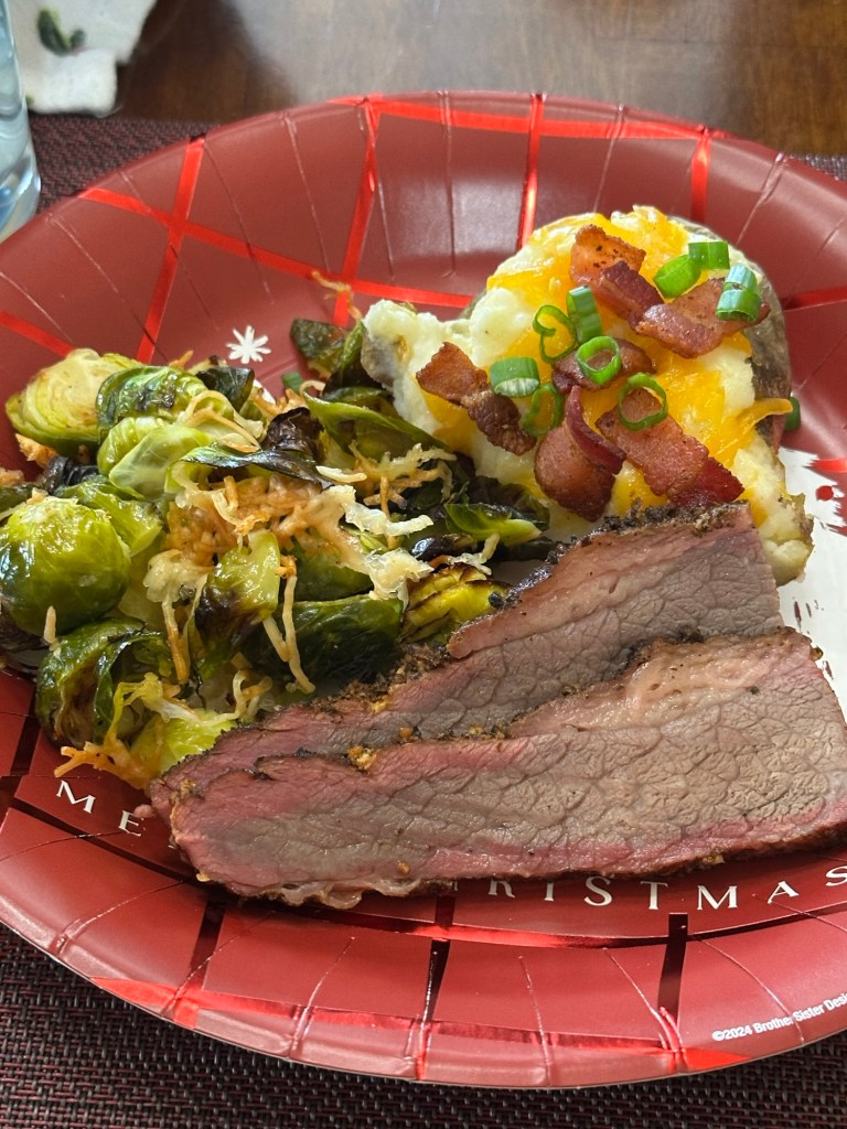 My husband smoked a brisket for our Christmas dinner and made twice baked potatoes to go with it. I wanted to do a side that was a little different than we normally do, so here’s a twist on brussel sprouts that my Mom and I really liked.