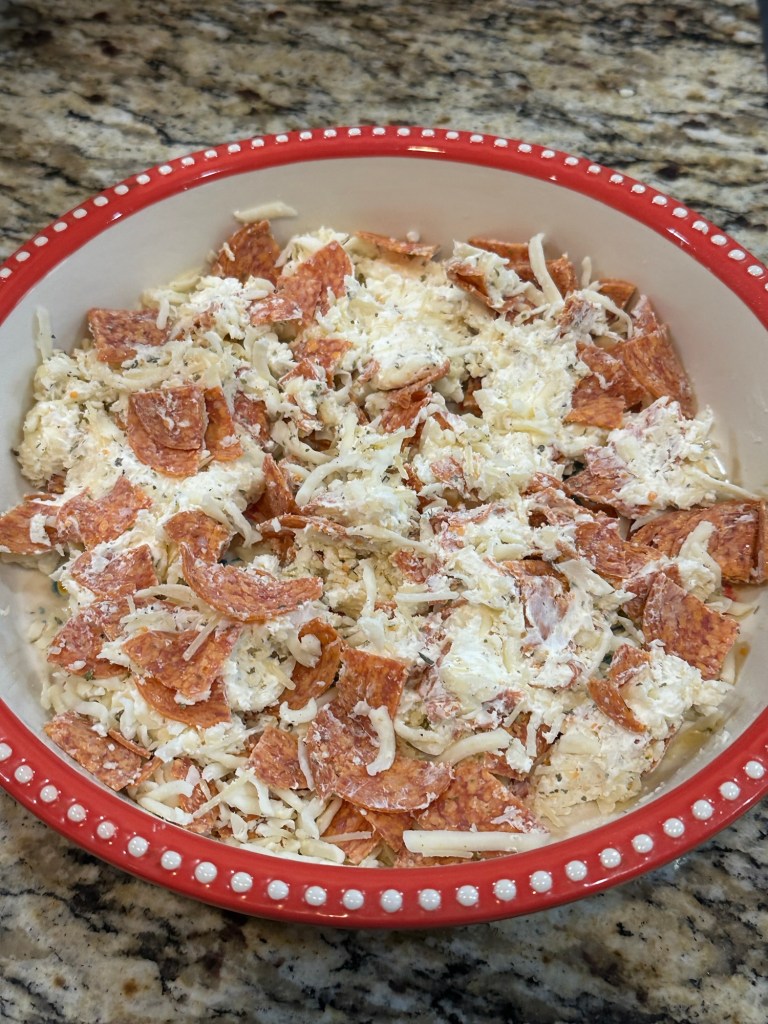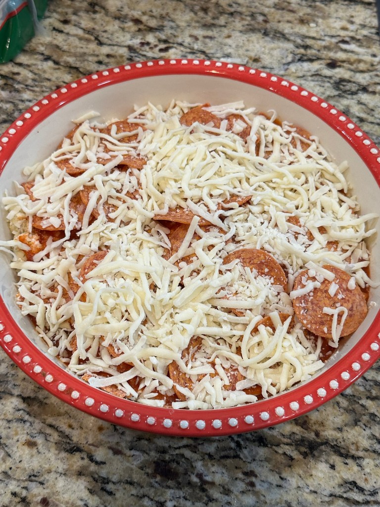 Set aside – 1/2 cup mozzarella cheese and about 20 slices of pepperoni. Quarter the rest of the pepperoni slices.