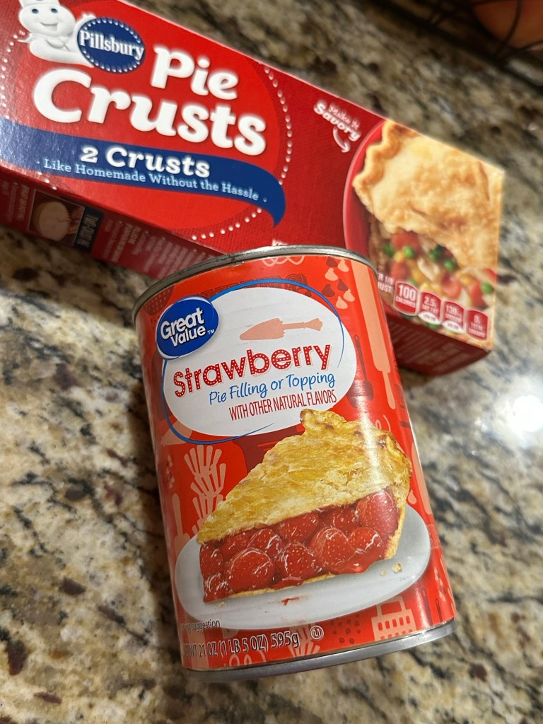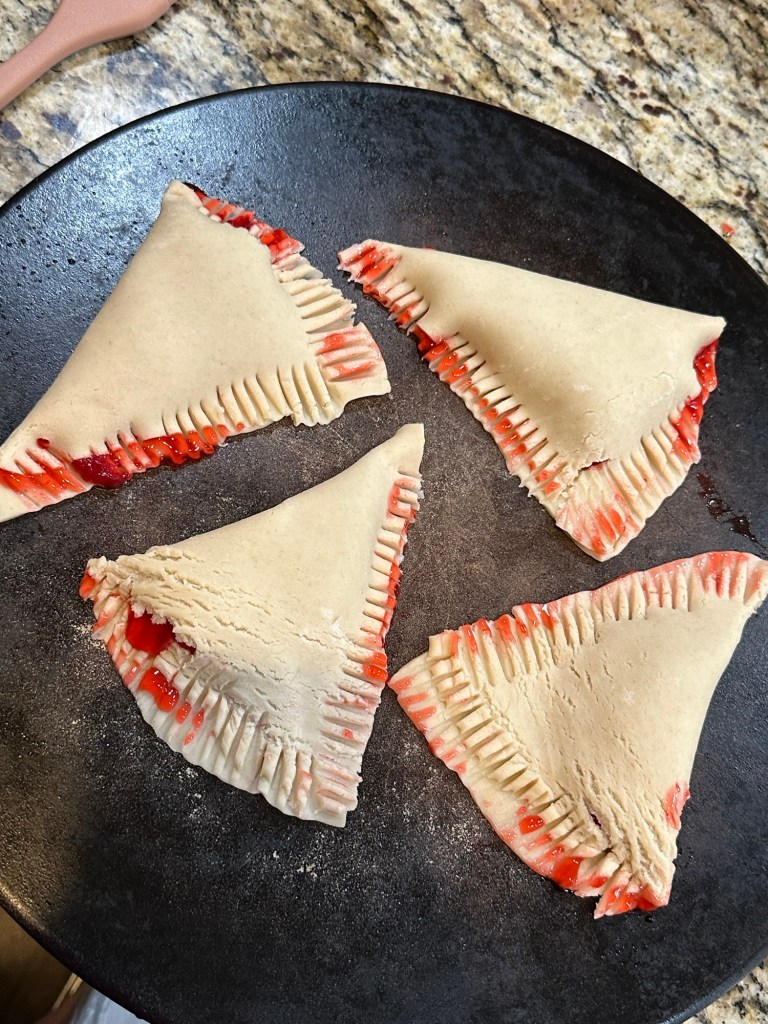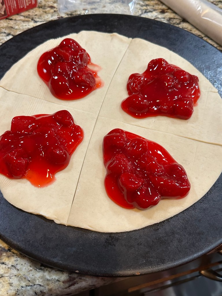 See below for how we cut the pie crusts and the amount of filling we used. Next time I would use about half the amount of strawberry filling.