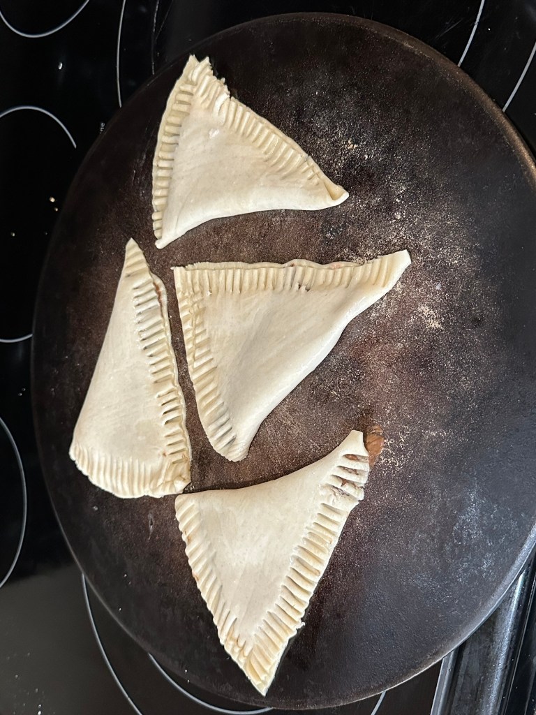 After folding them over like pictured below, use a fork around the edges to help seal them closed. I used a little too much filling, so some of it came out during this part.