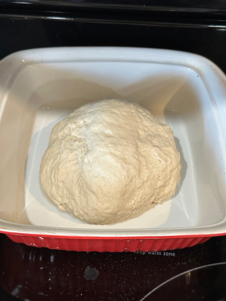 5. Cover with plastic wrap and put in a warm spot to rise for 20-30 minutes. We like to preheat the oven and put the bowl on the stovetop surface. We also covered the plastic wrap with a kitchen towel for this part.