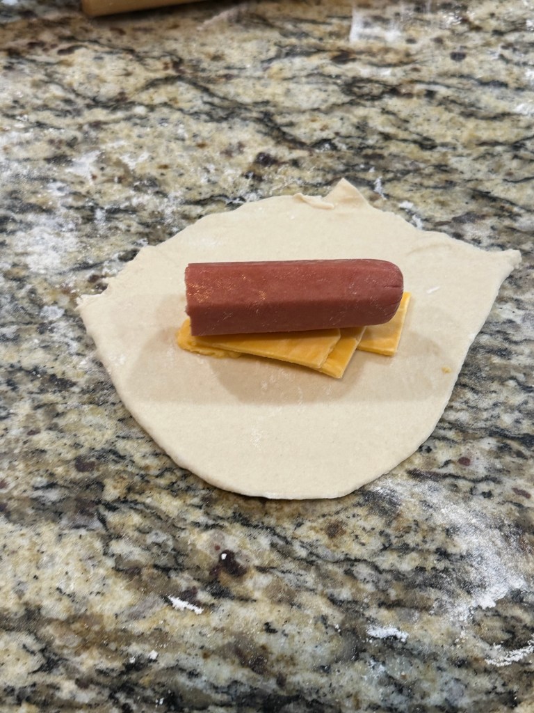 7. For each piece of dough, flatten it out and add to the center: half of a hotdog and cheese slices.