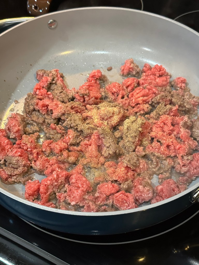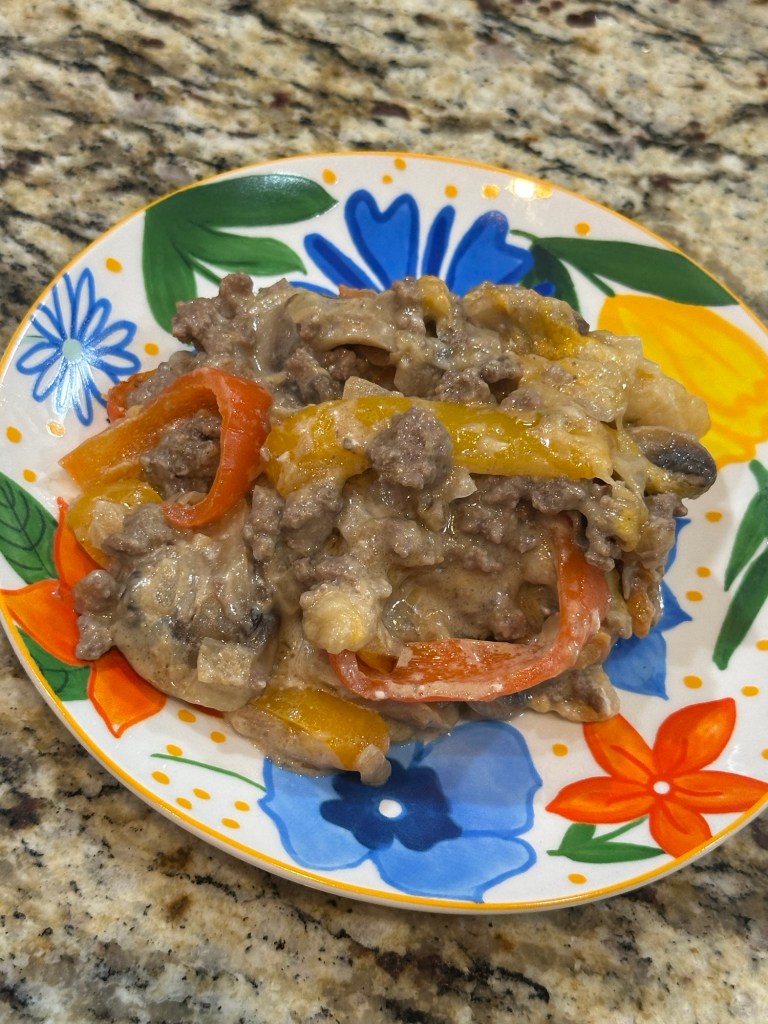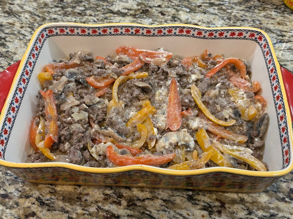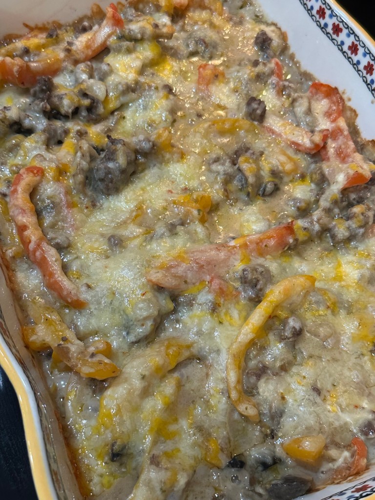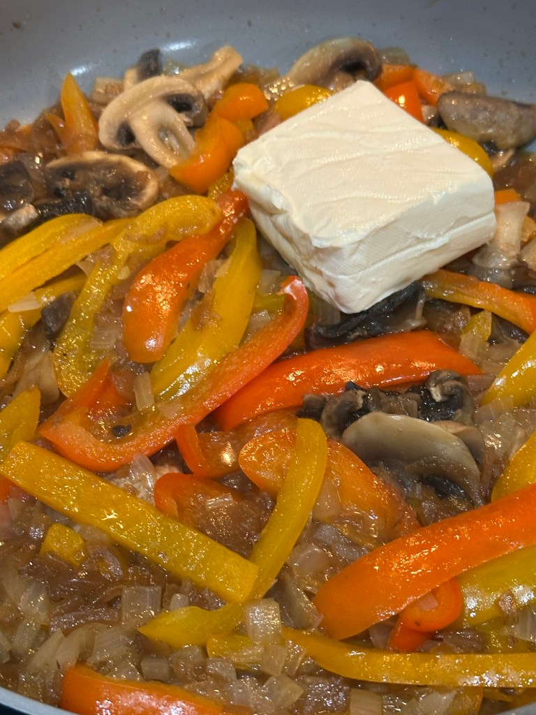Remove from heat put the cream cheese in with the softened veggies for a few minutes then stir gently to combine. Add in the cooked hamburger.