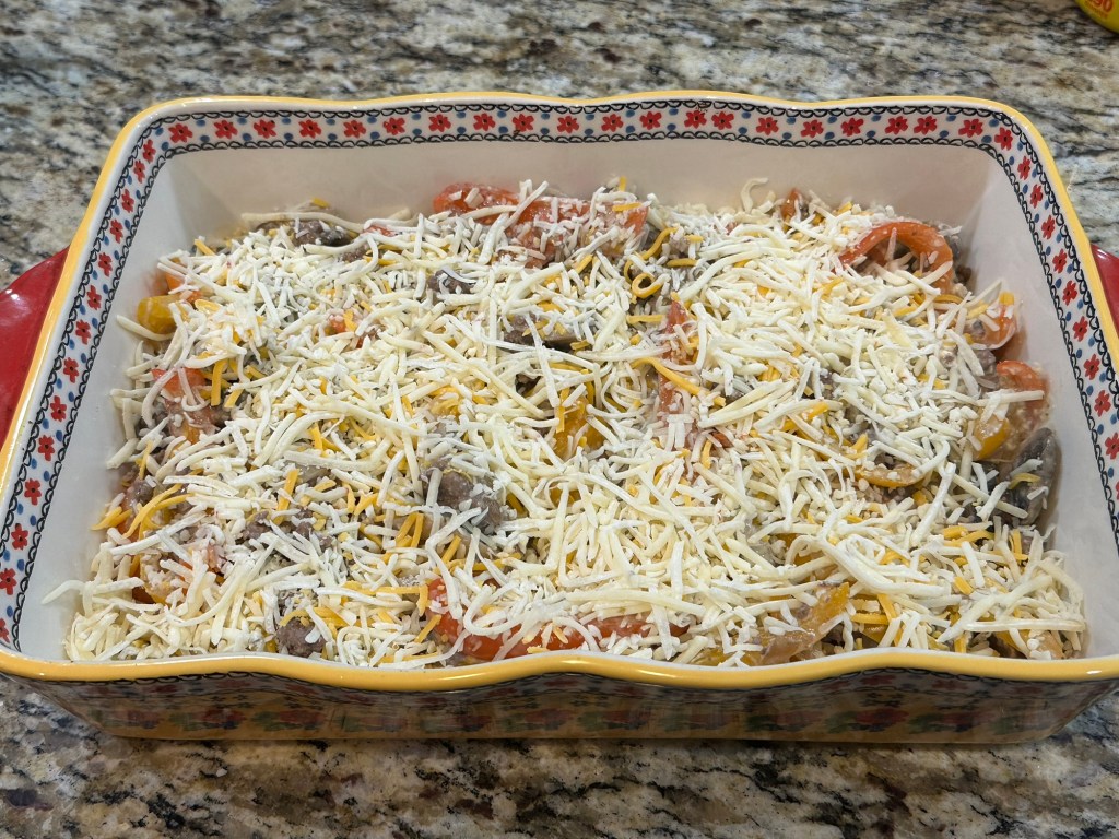 Spread into a casserole dish, top with cheese and bake at 375 for 30 minutes.