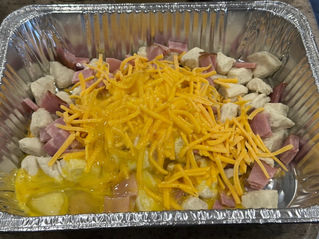 Whisk the eggs and then combine everything together well. I put 5 eggs in the recipe because we did 3 when we made it and the extra eggs will help add more moisture to the expanding biscuits.