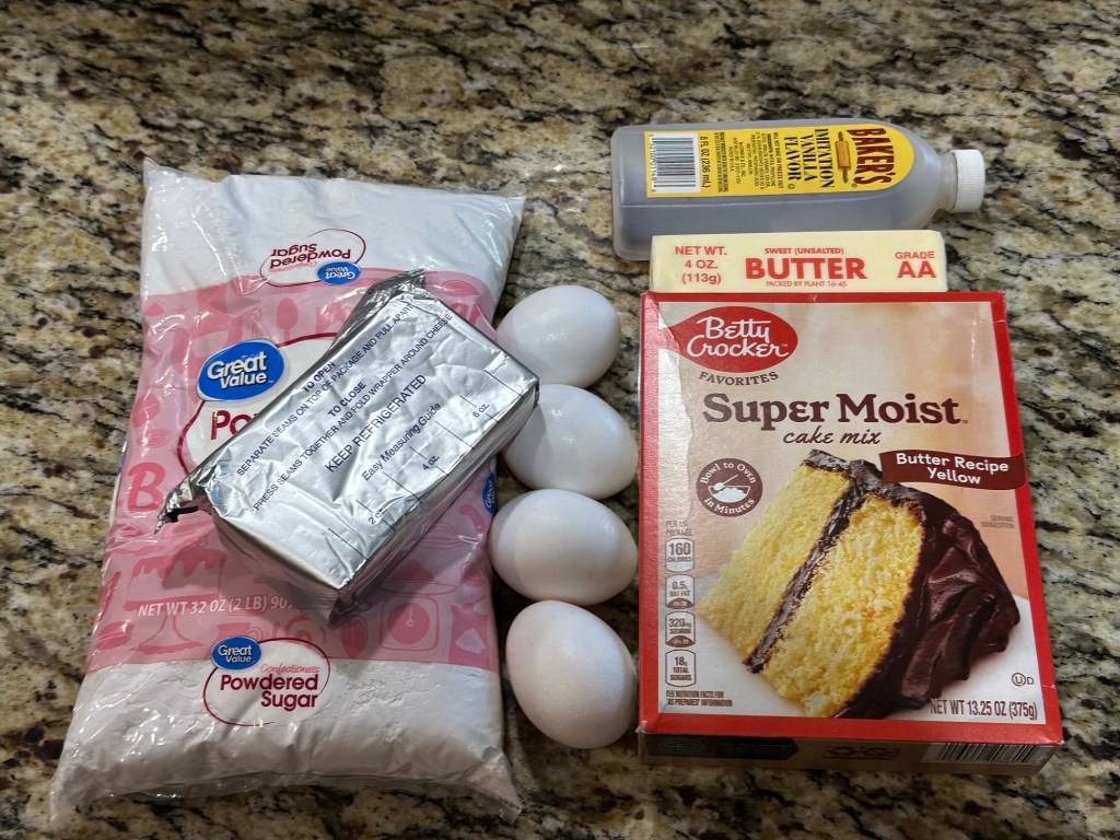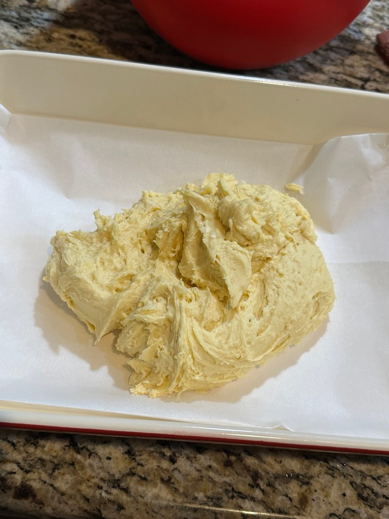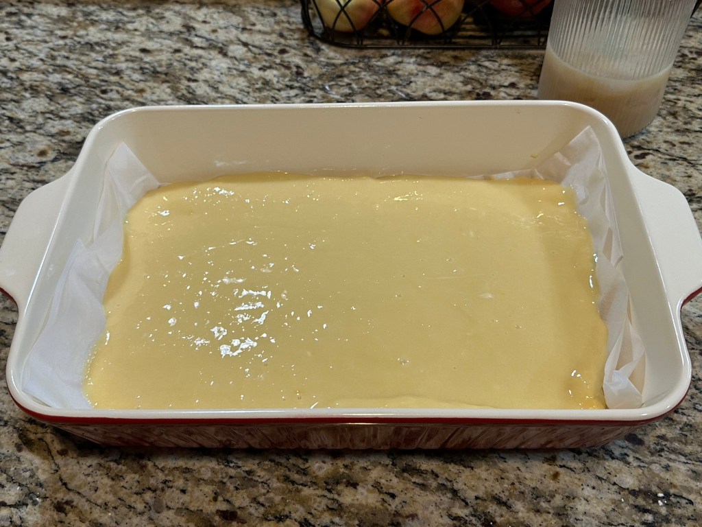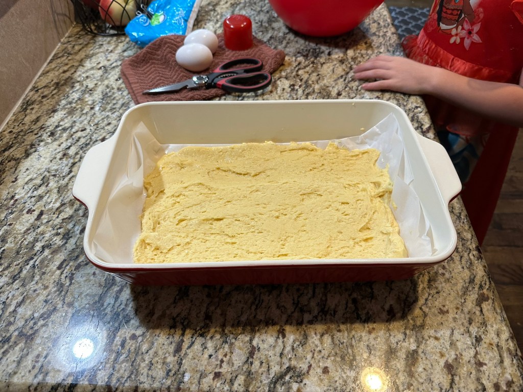For the base layer – Combine the yellow butter cake mix, two of the eggs and 1/2 cup of melted butter. You can do this by hand or with an electric mixer. Once combined well, spread into the bottom of the sprayed or lined pay. I’ve seen suggestions about spaying the spatula with non-stick spray to help make it easier to spread since it is a thicker looking batter.