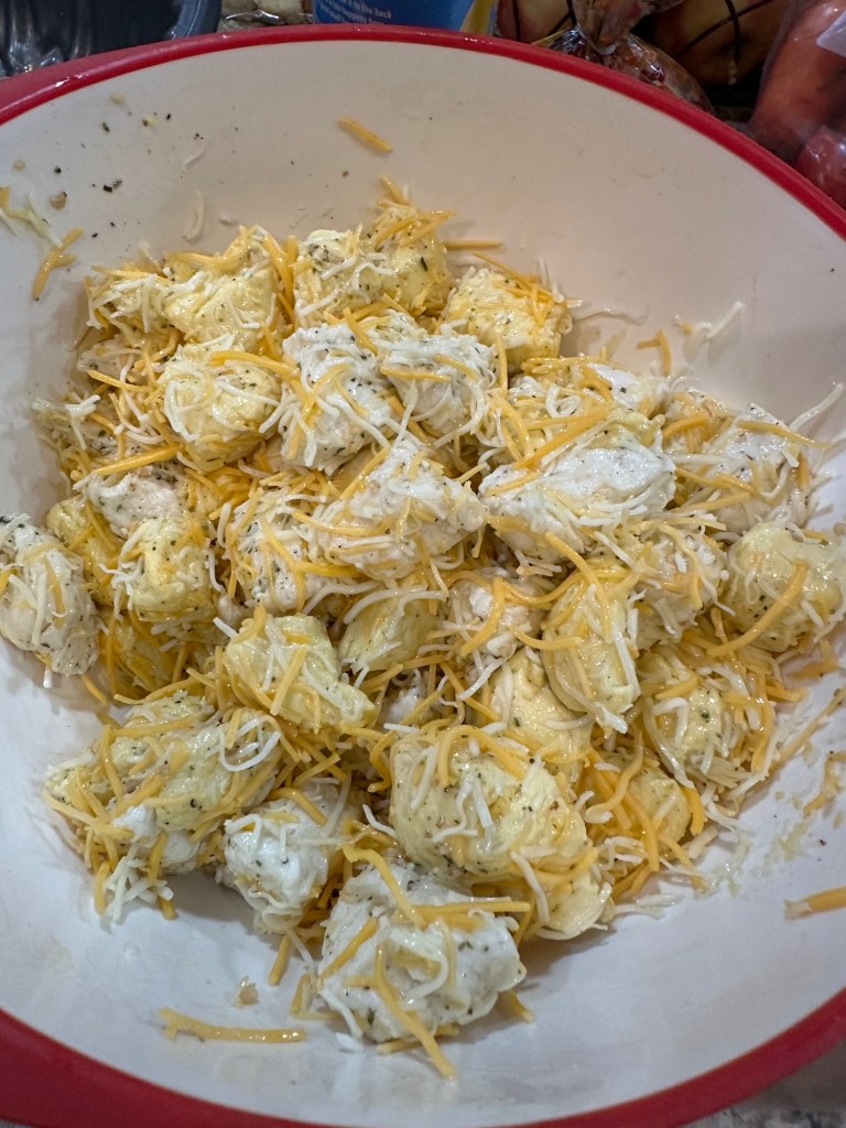 Gently toss the cut up biscuits with the butter and seasoning along with the shredded cheese.