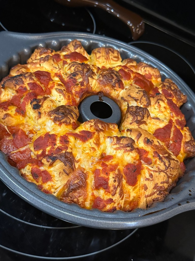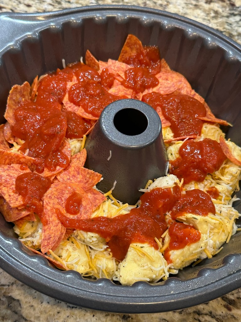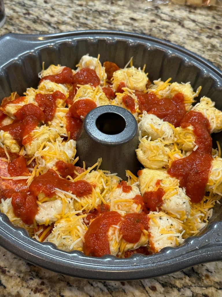 Incorporate a 2nd layer of each – the rest of the biscuits, pepperoni and another 1/2 cup of sauce