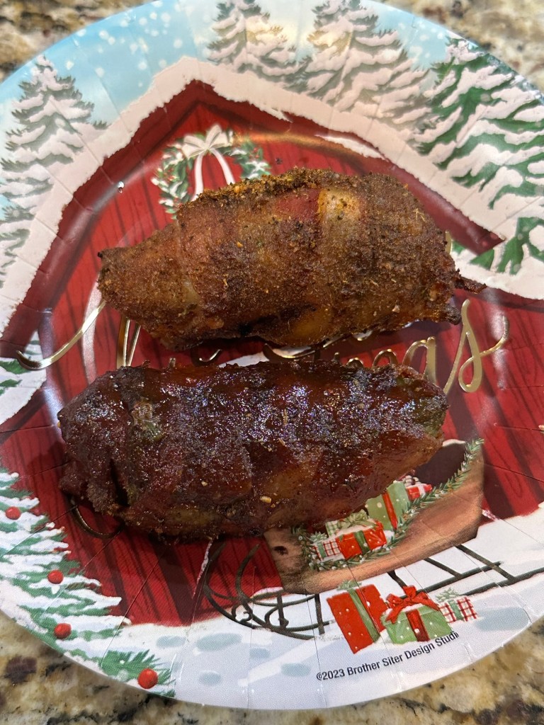 We tried some with and without BBQ sauce. The ones with BBQ sauce were really good because that 10 minutes caramelized the sauce and took them to the next level. We used Famous Dave’s Devil Spit.