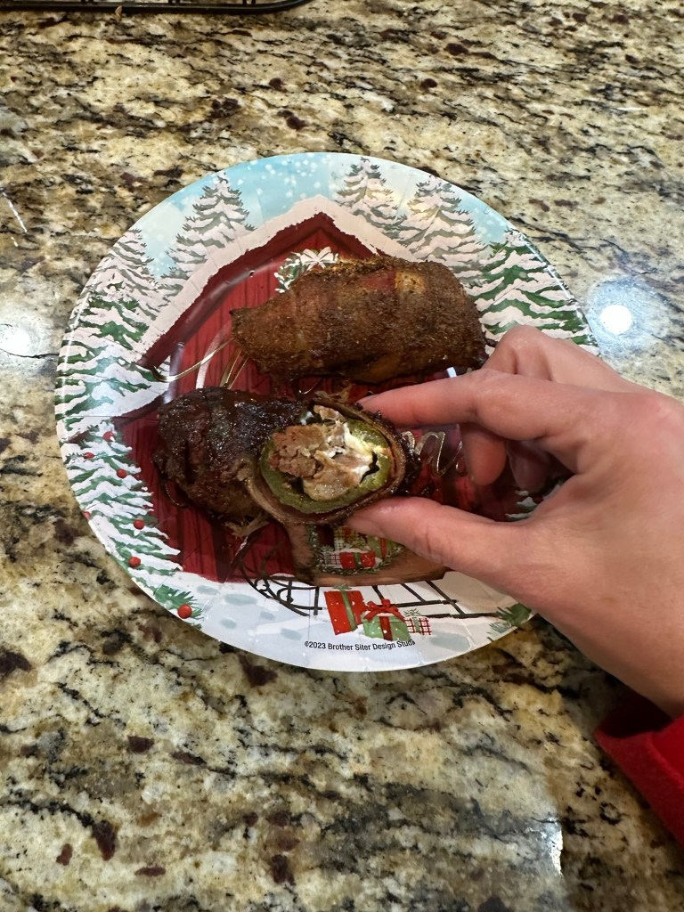 Stuff each of the cored jalapenos with a combination of cheese and meat then wrap each one wit the bacon. Place on the smoking rack with the bacon ends on the rack.