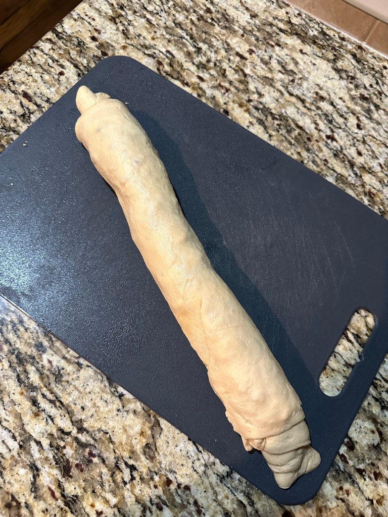 Roll up like the picture below (like you would for cinnamon rolls) and make 1 inch slices.