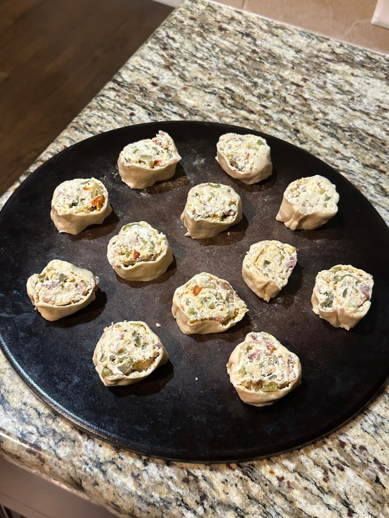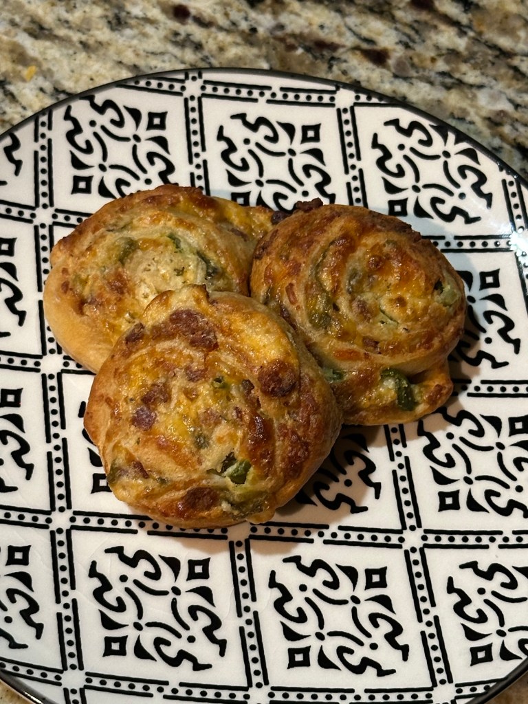 This recipe came to be on this particular day because one of the crescent roll tubes popped open on the way home from the store. They were on sale and I got a couple that were a sheet of crescent dough rather than the traditional triangles. It worked great and was so good that we made it again just a couple days later to have again last night for New Year’s Eve.