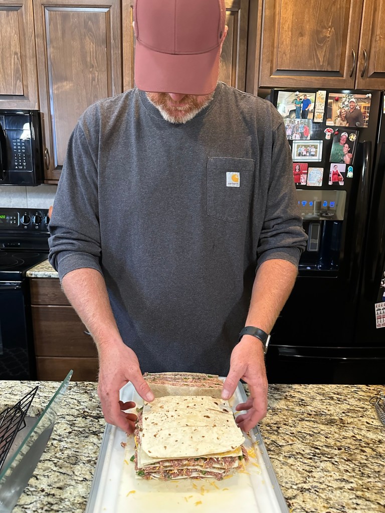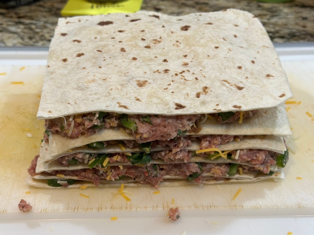Start with a tortilla on the cutting board and then spread out an even layer of the meat combination. Lay the next tortilla on top and repeat through the layers.