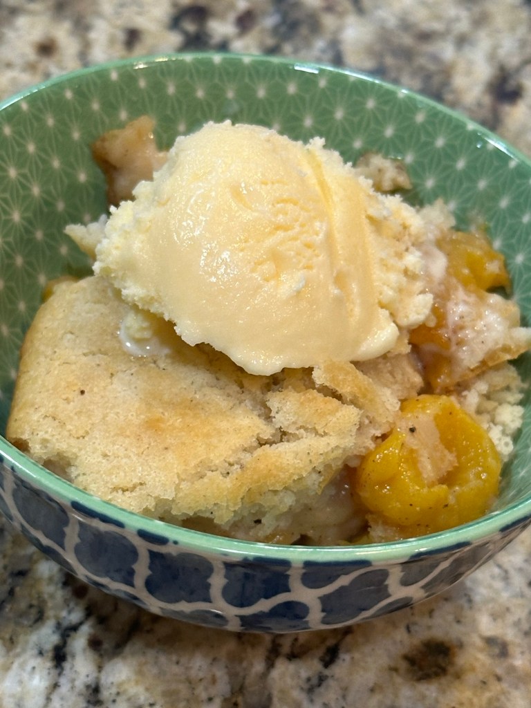 Spring is here and one of the things that it has me thinking about is cleaning things out and using things up. Remember when we froze peaches late summer/early fall. This recipe uses some and it was delicious!
