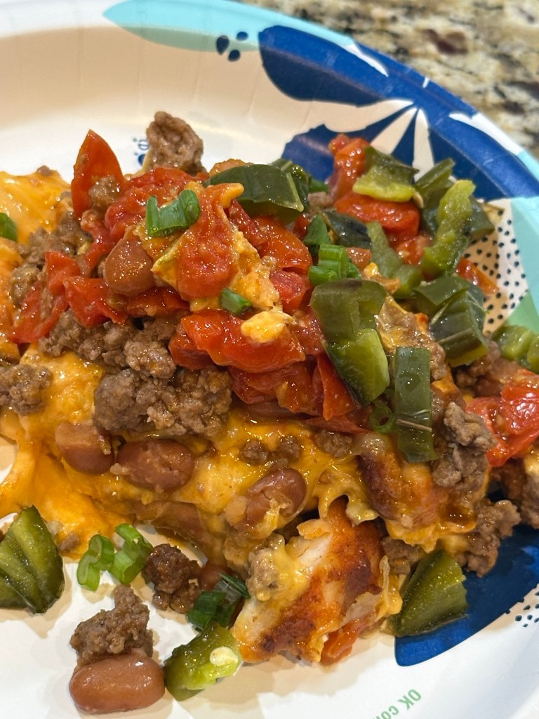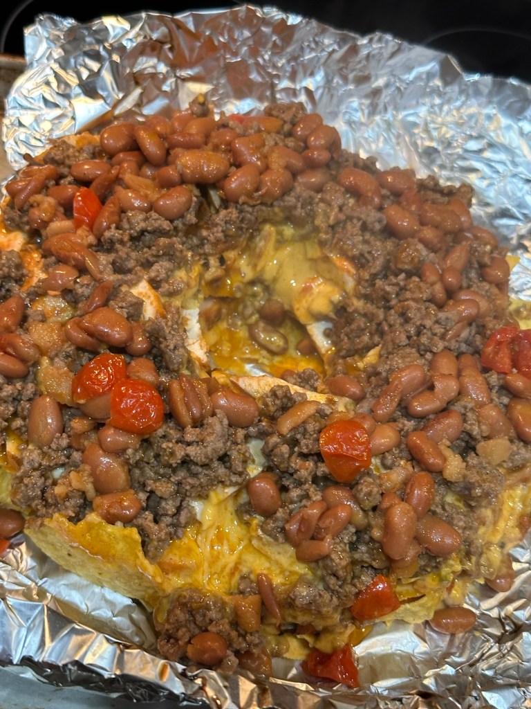 My husband layered the following in a bundt pan: tortilla chips, cooked ground beef with taco seasoning, queso, rotel, chili beans, diced grilled chicken and shredded cheese. Bake at 350 for 15 minutes and then flip onto a sheetpan. These were really good.